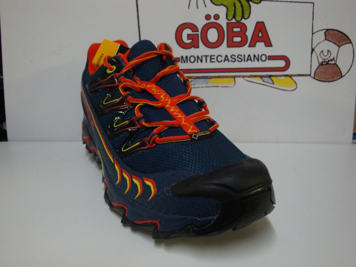 Calzatura in membrana Gore-Tex sviluppata per utilizzi invernali su percorsi off-road di lunga distanza, competizioni ultra-marathon e sessioni di allenamento prolungate. La tomaia ? in mesh anti abrasione traspirante e water repellent, la fodera ? in membrana Gore-Tex Extended Comfort a garanzia di impermeabilit? e traspirabilit?. Il sistema di allacciatura ? integrato alla tomaia a mezzo di fettucce cucite sul tessuto elastico interno e con rinforzi in alta frequenza sul mesh esterno: questo permette di ripartire la tensione dell?allacciatura su tutta la tomaia ed avvolgere meglio il piede per un perfetto comfort di calzata. Ultra Raptor GTX unisce i vantaggi in termini di performance di una costruzione contenitiva a quelli di comfort derivati da una forma comoda e con pianta larga. Il risultato ? un prodotto indossabile per molte ore consecutive ed adatto per utilizzo endurance su qualsiasi tipo di terreno off-road nei mesi invernali o in situazioni di elevata umidit?, grazie alle doti di impermeabilit? della fodera Gore-Tex. Suola ad alta aderenza realizzata in mescola La Sportiva FriXion XF.